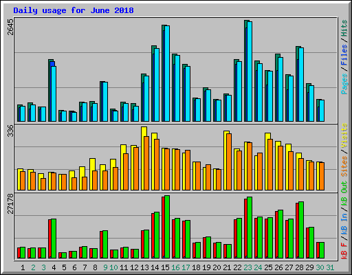 | Day | Hits | Files | Pages | Visits | Sites | kB F | kB In | kB Out | ||||||||